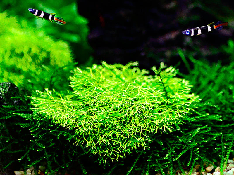 Japanese Takashi Amano has inspired many aquarium owners to keep the 1-5 cm tall cosmopolitic moss, Riccia fluitans, submerged. It can be kept down by tying it to a stone with a piece of fishing line, but new shoots always grow towards the surface, so it may be necessary to prune it with scissors. Riccia fluitans thrives best with added CO2 and in good growing conditions small oxygen bubbles form on the leaf tips. As a traditional floating plant offers good protection for young fish.
